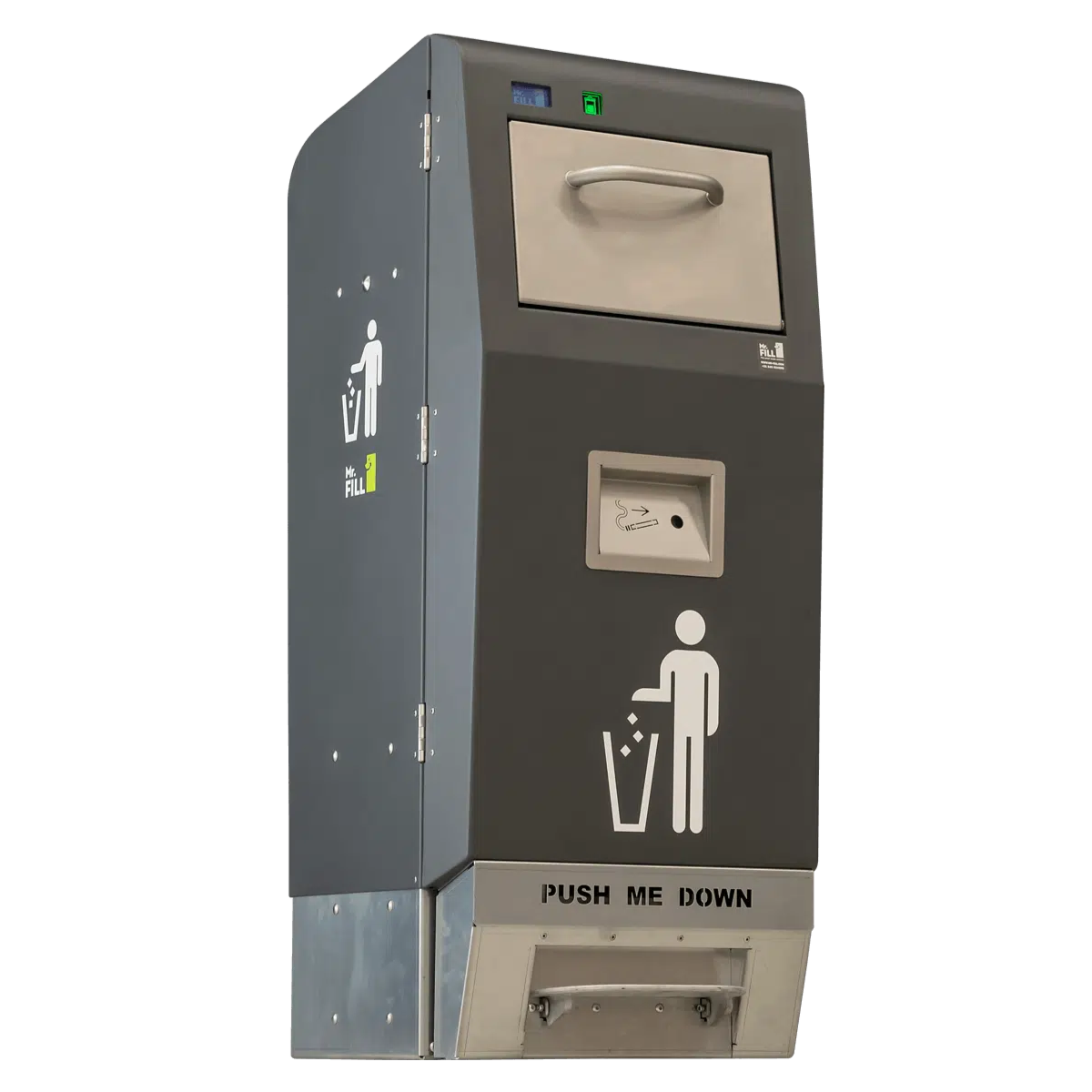 MR.FILL Ultra Fill 120L Standard – Solarni kompaktor za odpadke, namenjen zmanjševanju volumna odpadkov na javnih površinah. Izdelek je zasnovan in razvit na Nizozemskem. V primerjavi s standardnim košem lahko obdela do 5-krat več odpadkov.